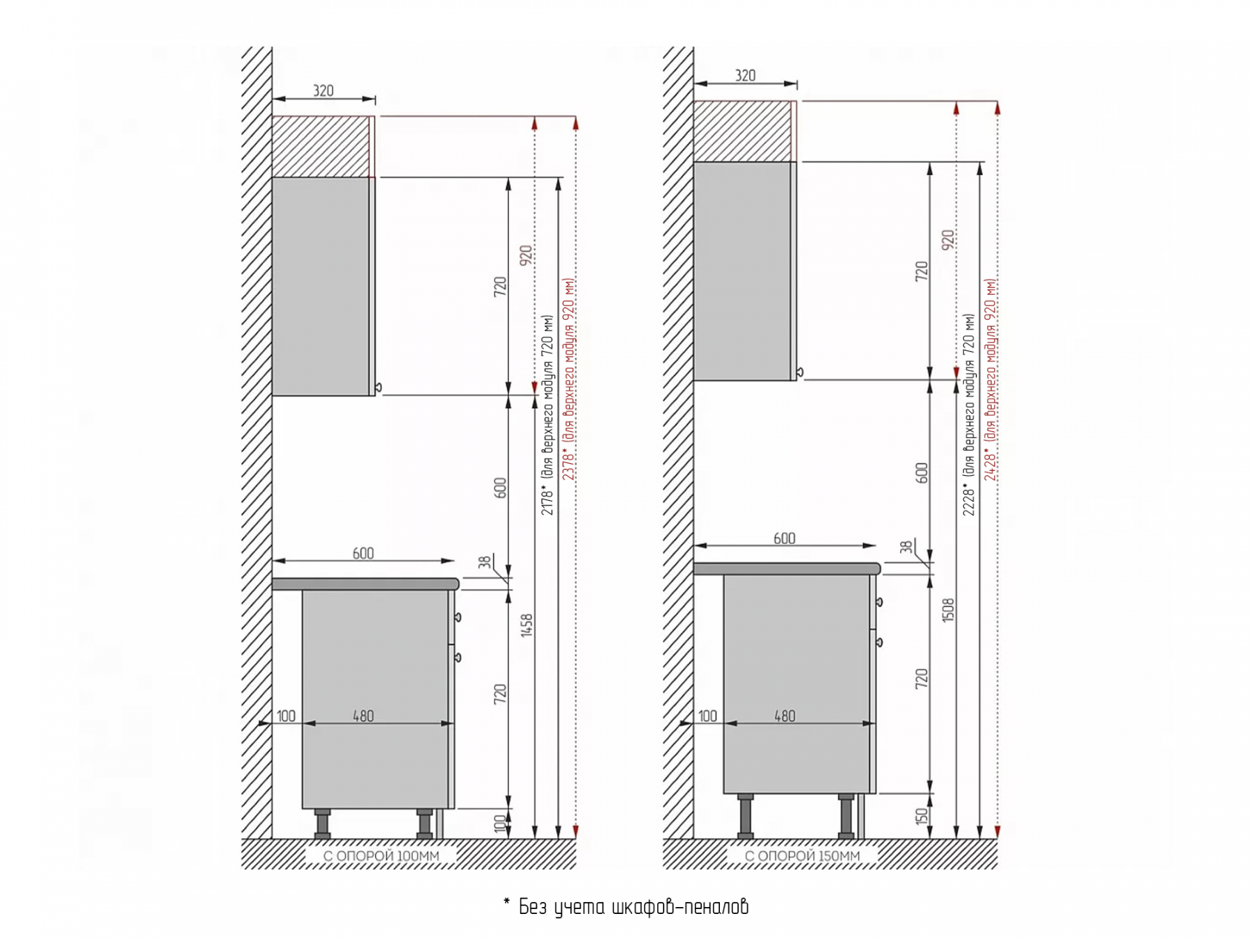 Глубина нижних модулей (600 мм) указана по столешнице, фактический размер меньше (480 мм) для сантехнических нужд.